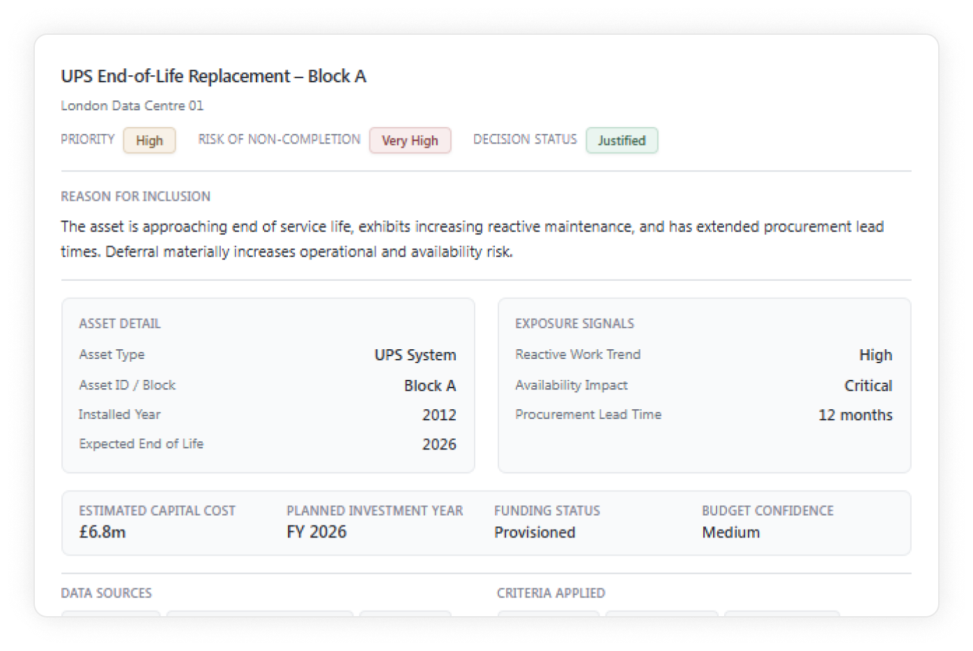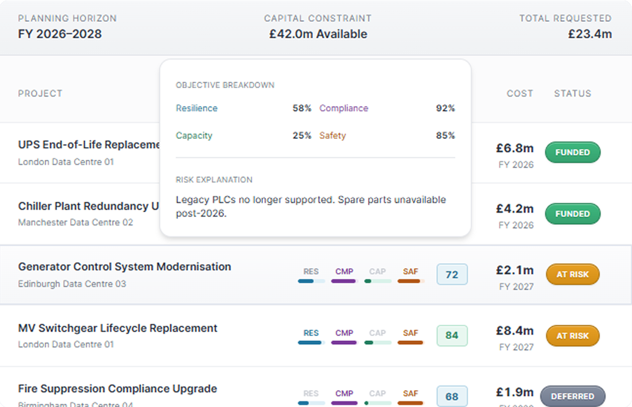 It replaces fragmented spreadsheets, disconnected risk inputs, and manual prioritisation with a single governed system that validates data quality, enhances decision-critical information, applies real-world constraints, and ensures capital decisions are made with full visibility of risk, impact, and capacity.